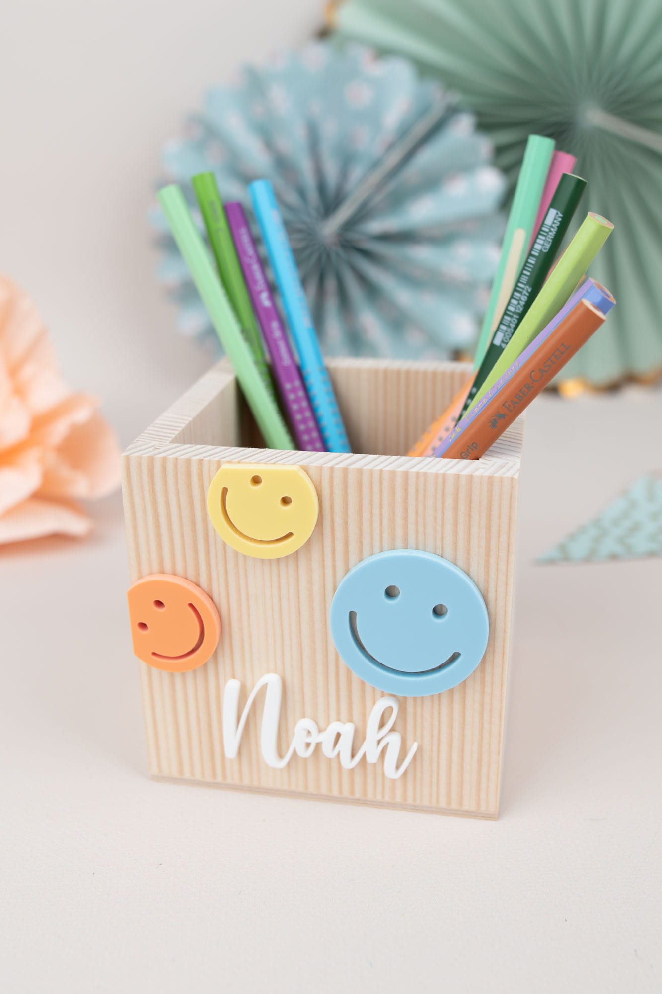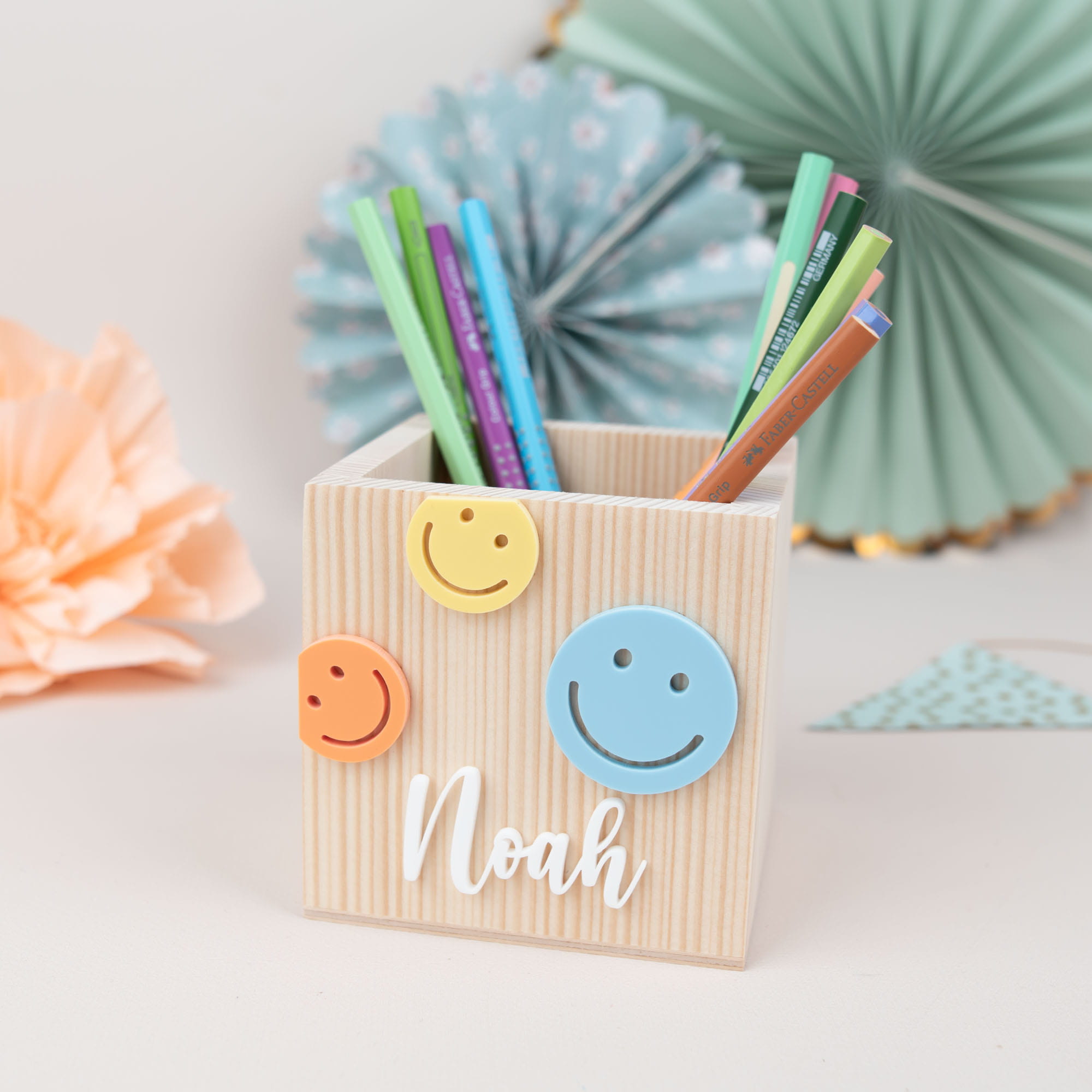 Personalisierte Stiftehalter mit süßem buntem Smilies Motiv Machen Sie den Schulstart unvergesslich mit unserem einzigartigen Stiftehalter mit Namen.
