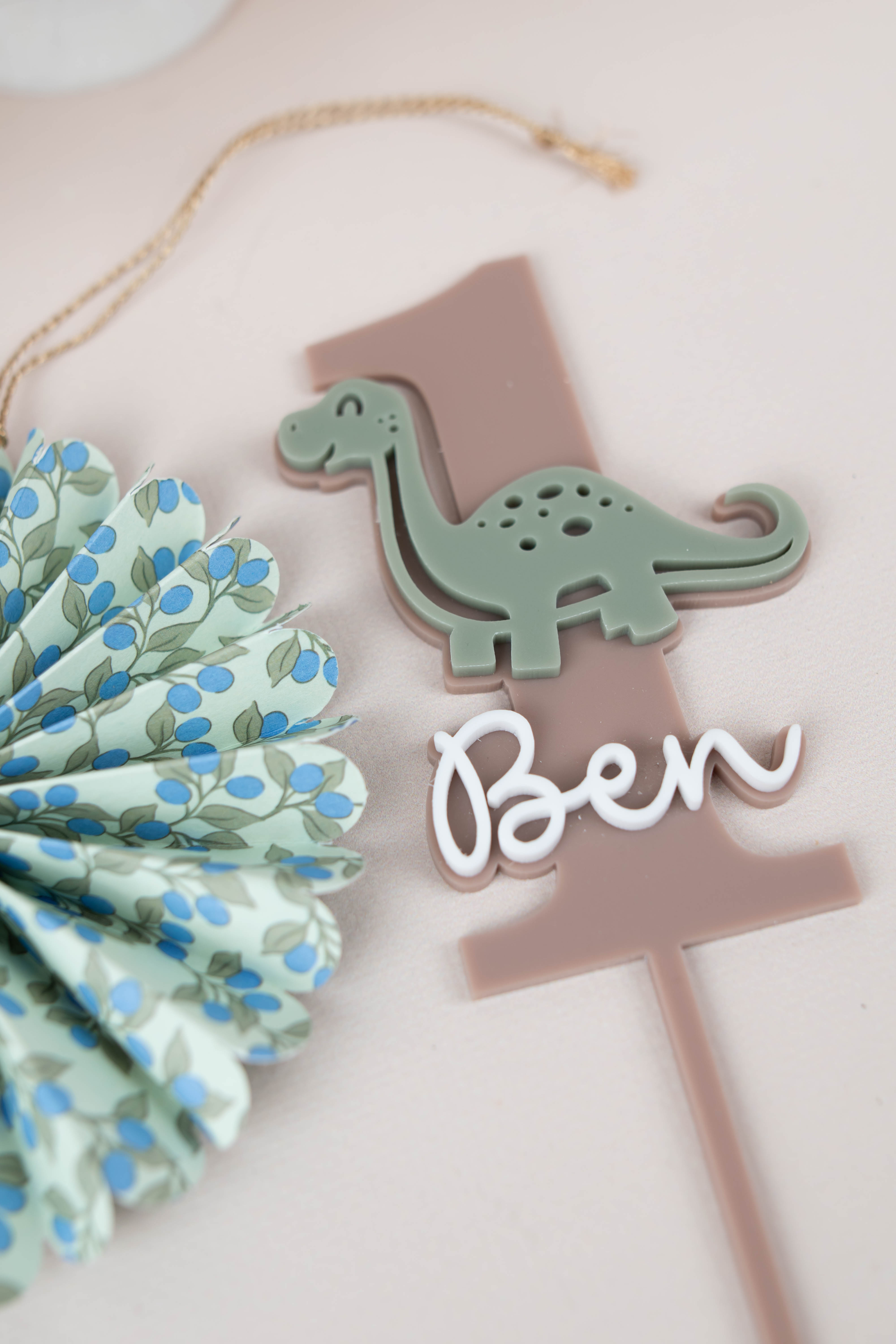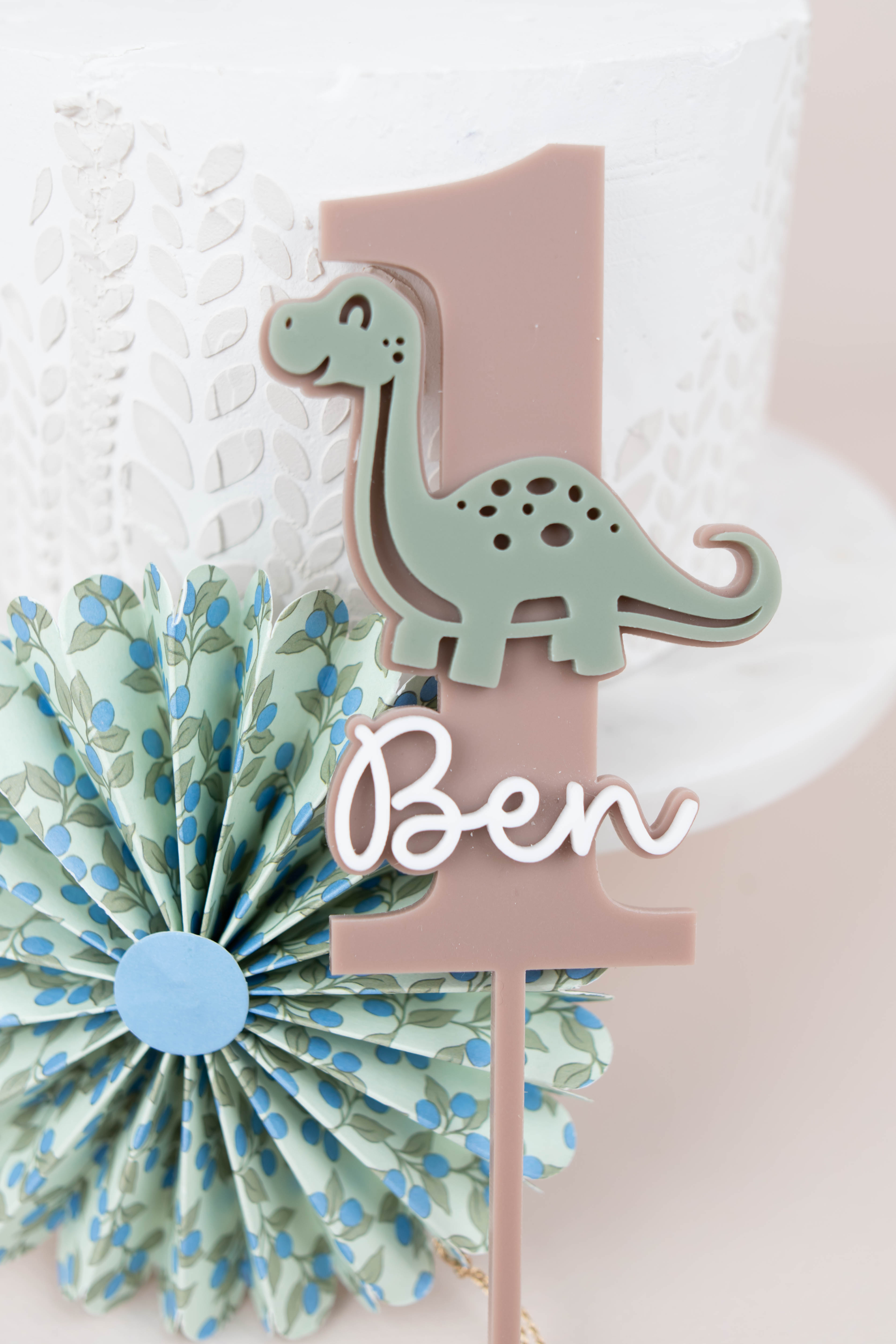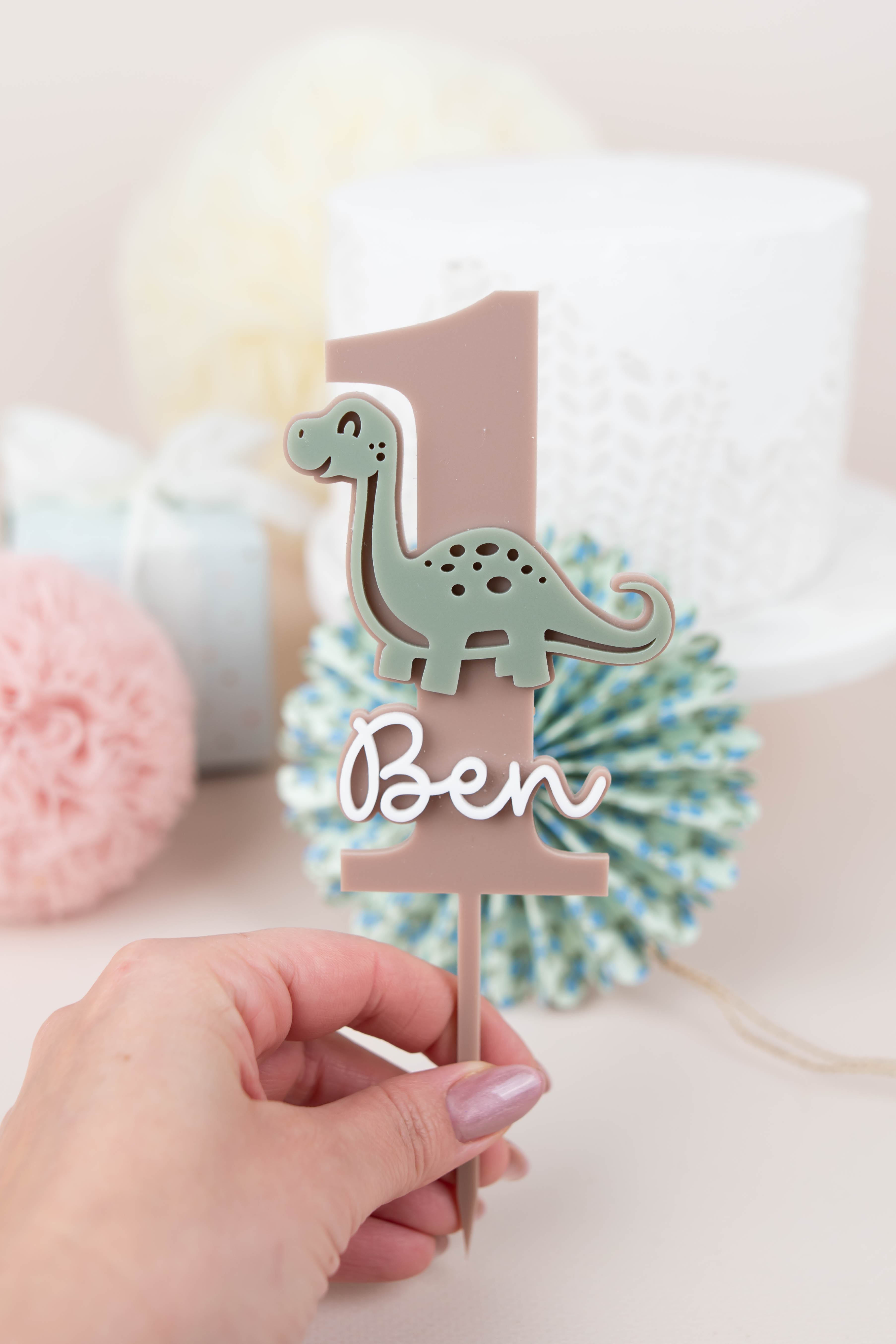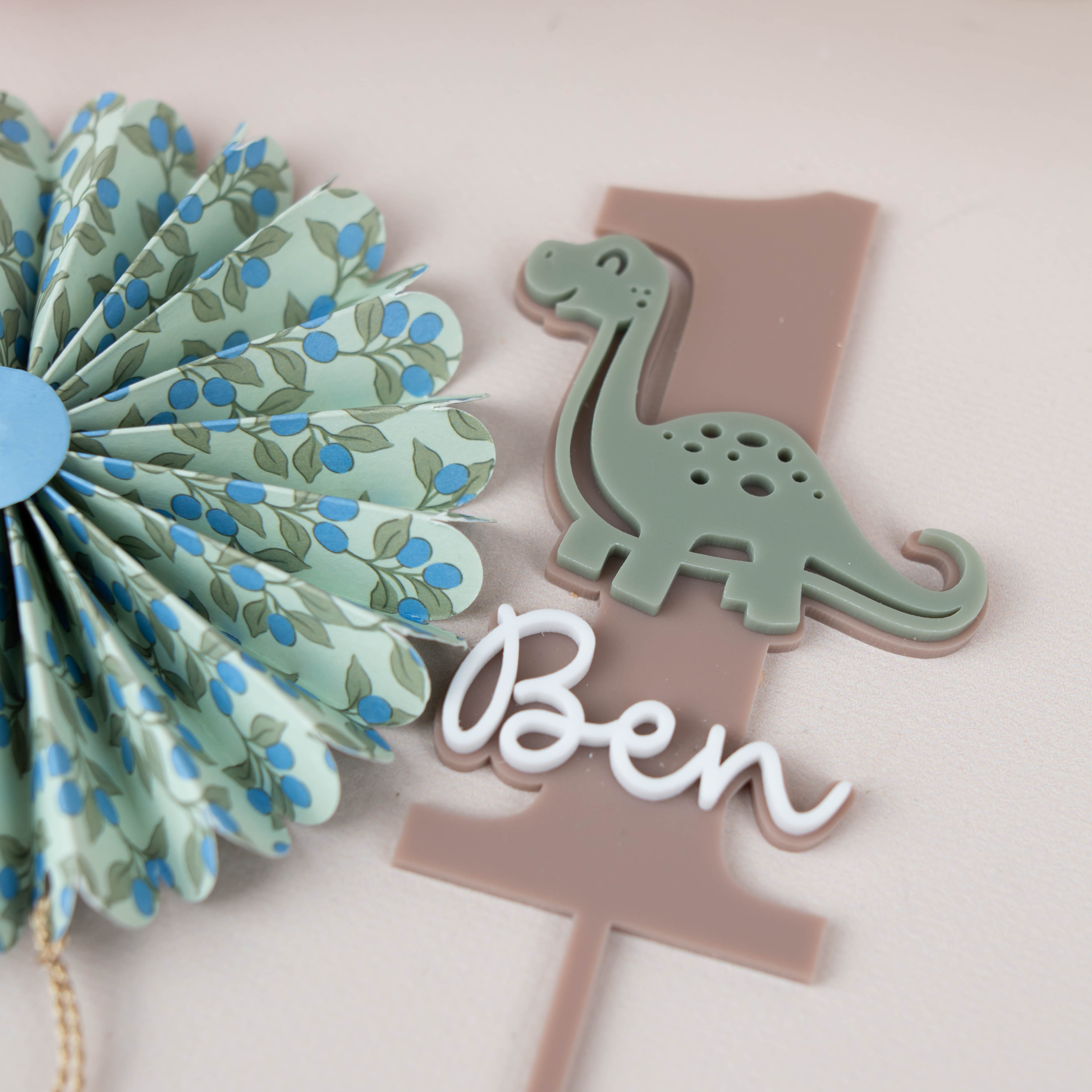 Personalisierter Cake Topper im Dino-Design – die perfekte Ergänzung für eine liebevoll gestaltete Geburtstagstorte. Name und Zahl sind frei wählbar, sodass der Topper nicht nur für den 1. Geburtstag, sondern auch für weitere Kindergeburtstage geeignet ist. Das natürliche Farbkonzept fügt sich harmonisch in jede Dino-Mottoparty ein und rundet die Dekoration stilvoll ab.