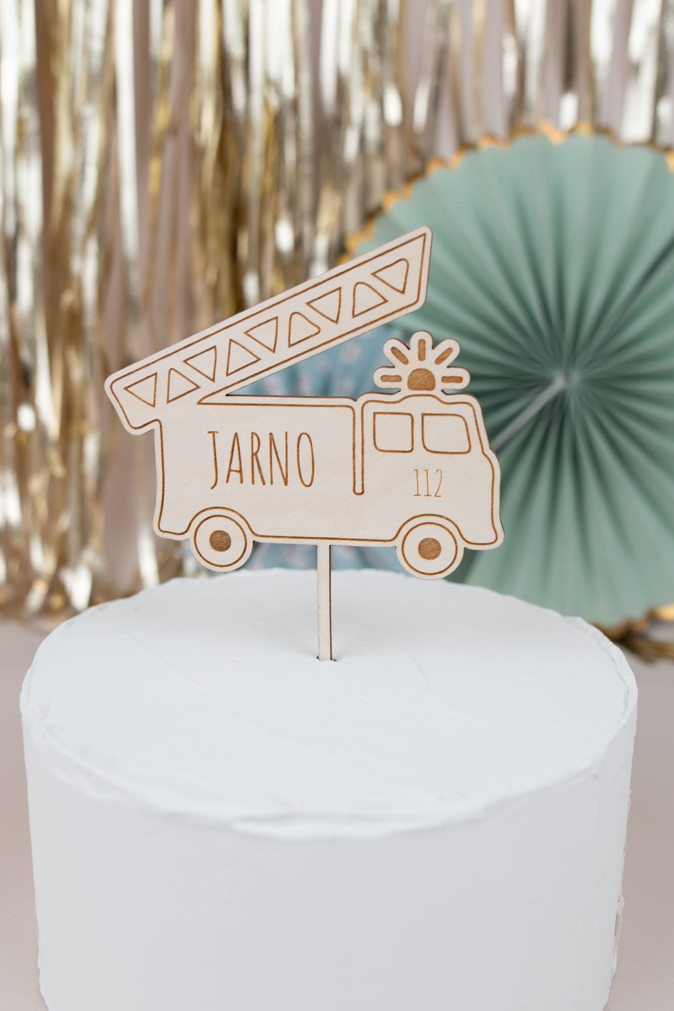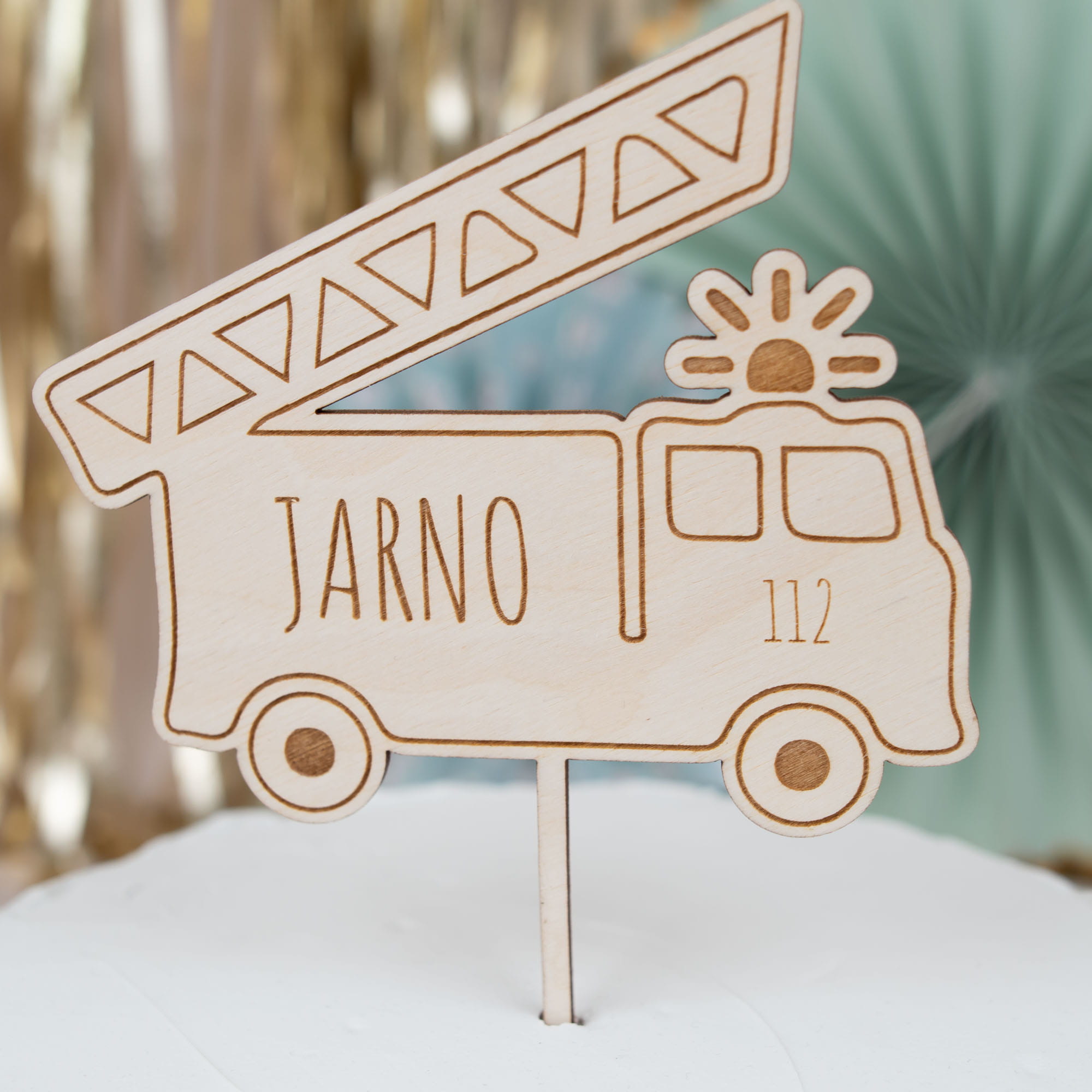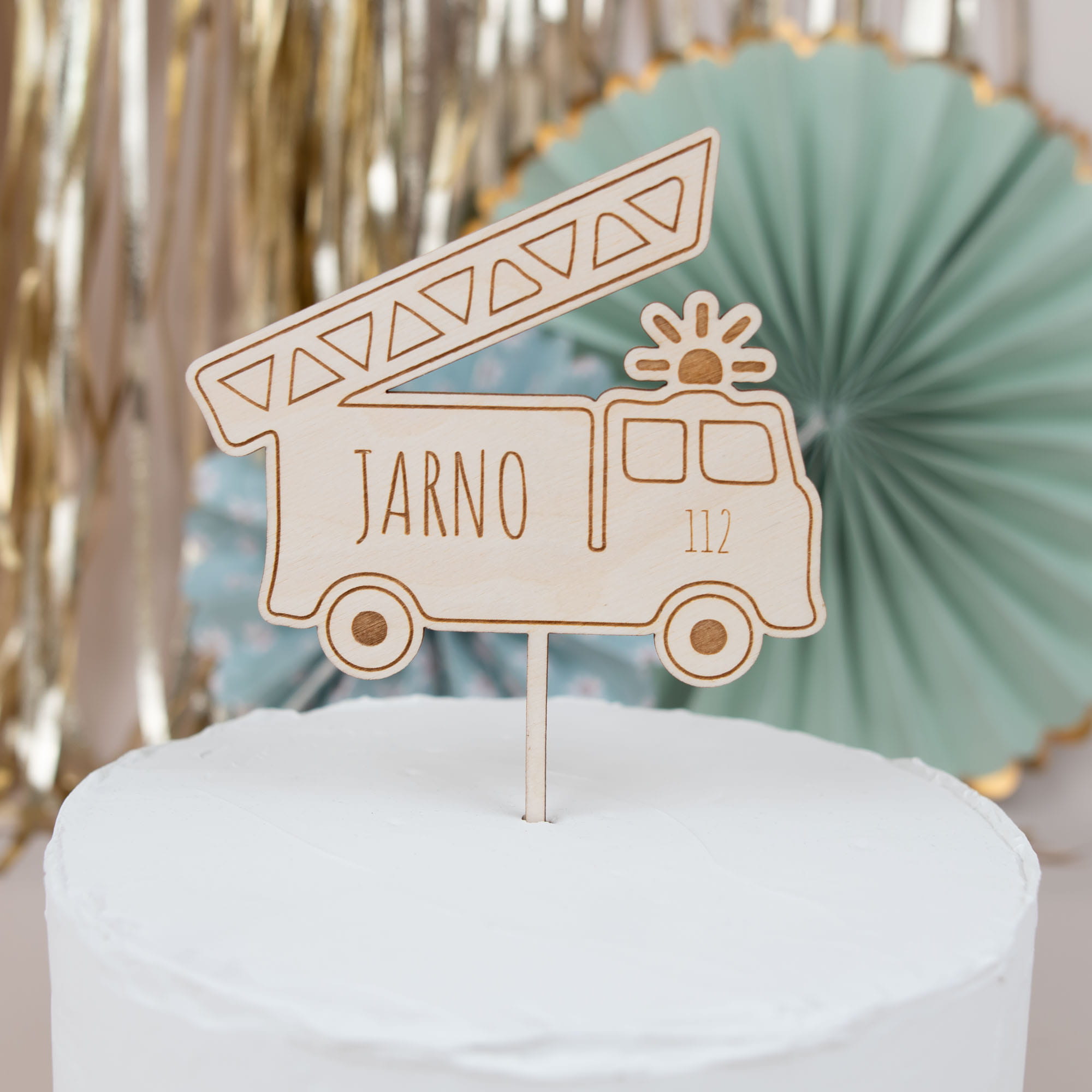 Unser liebevoll handgefertigter Cake Topper in Form eines Feuerwehrwagens ist die perfekte Tortendeko für alle Feuerwehr-Fans – egal ob jung oder alt! Aus hochwertigem Holz gefertigt und individuell mit dem Namen des Geburtstagskindes graviert, macht dieser Tortenstecker jede Torte zu einem echten Blickfang. Der detaillierte Feuerwehrwagen mit Leiter und dem typischen "112"-Notrufsymbol bringt ein Stück Abenteuer auf den Tisch und sorgt für Begeisterung.
