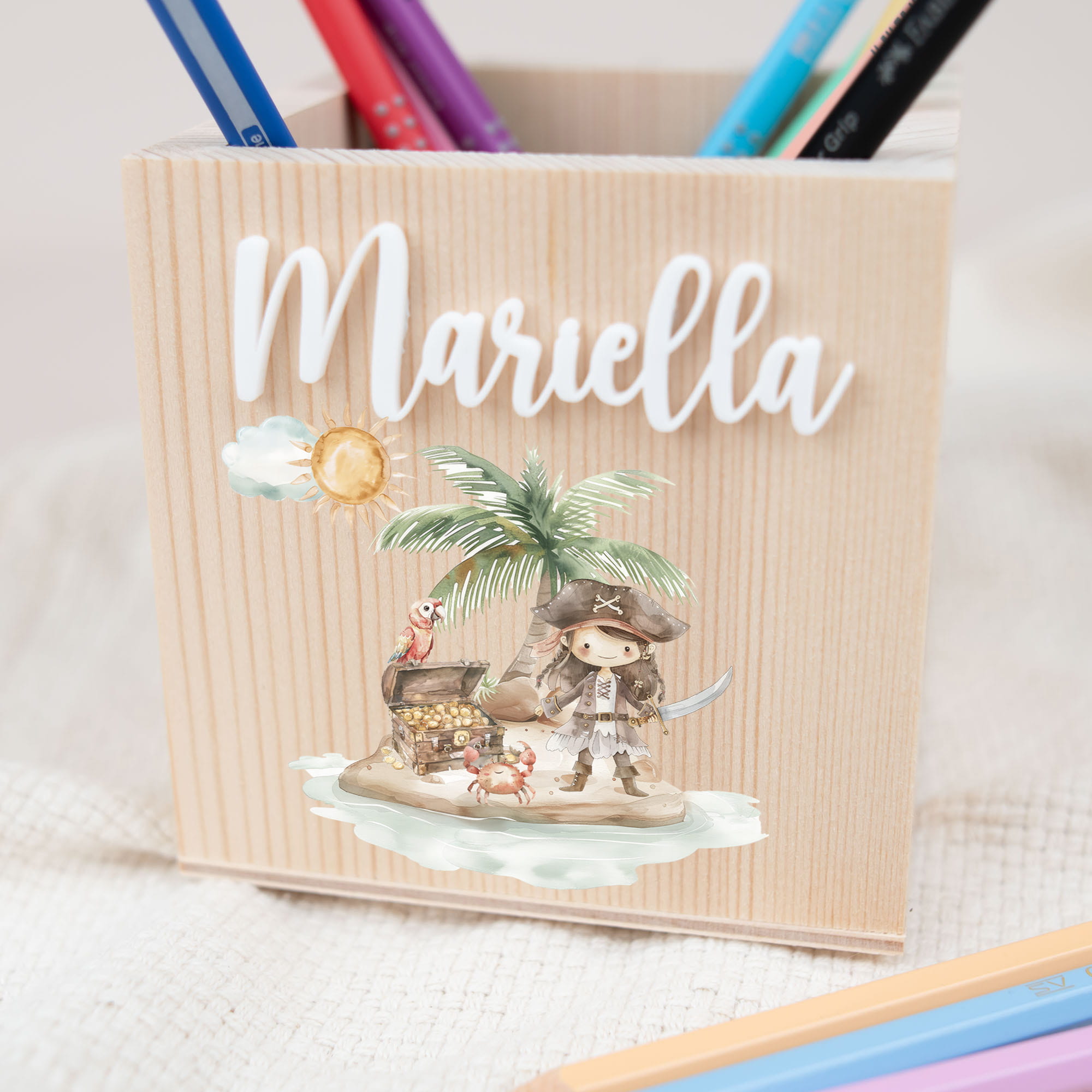 Perfekt für kleine Kreative In unserem personalisierbaren Stiftebecher findet alles seinen Platz – Stifte, Pinsel und kleine Schätze. Aus robustem Kiefernholz gefertigt und mit kindersicheren Farben bedruckt, bleibt er ein treuer Begleiter für alle kreativen Abenteuer am Schreibtisch.