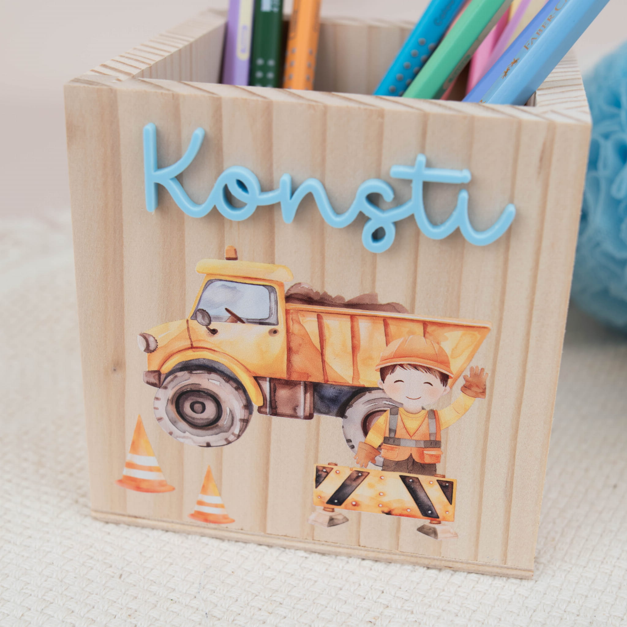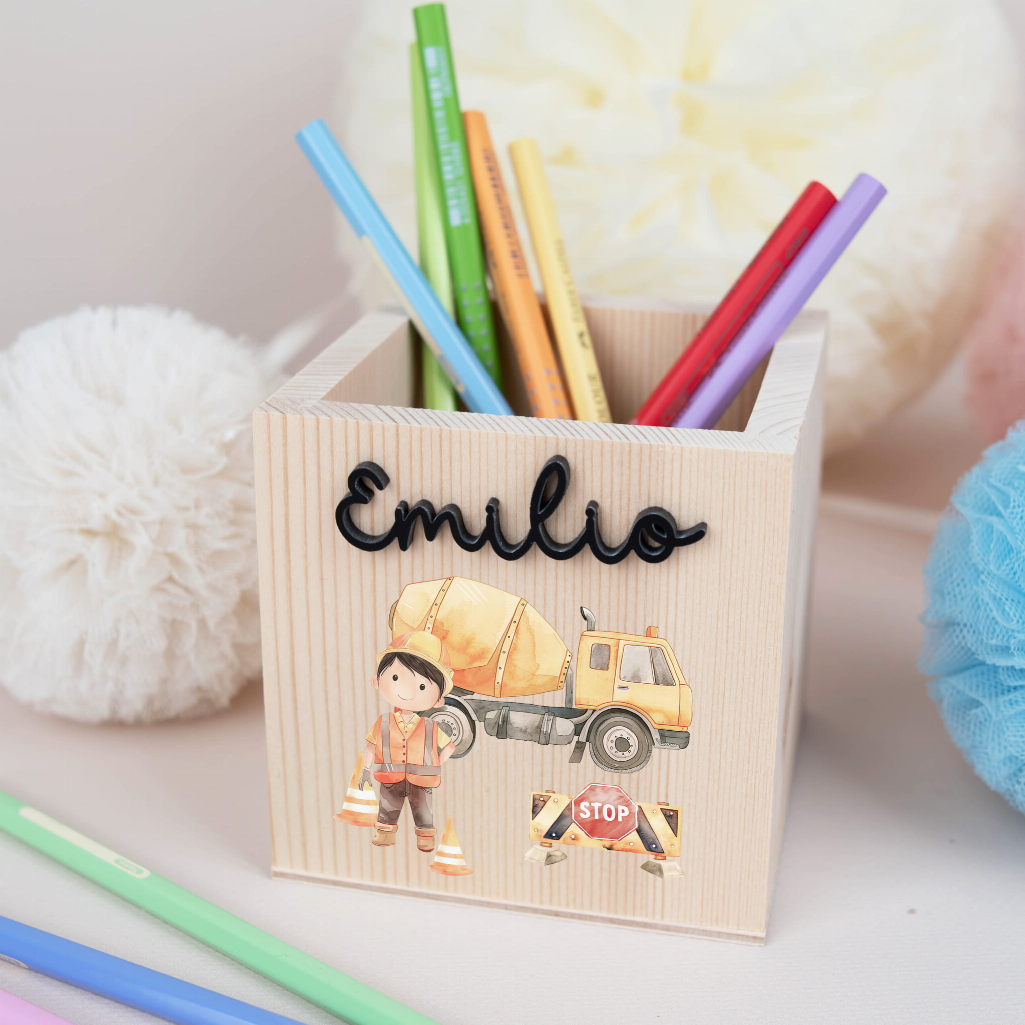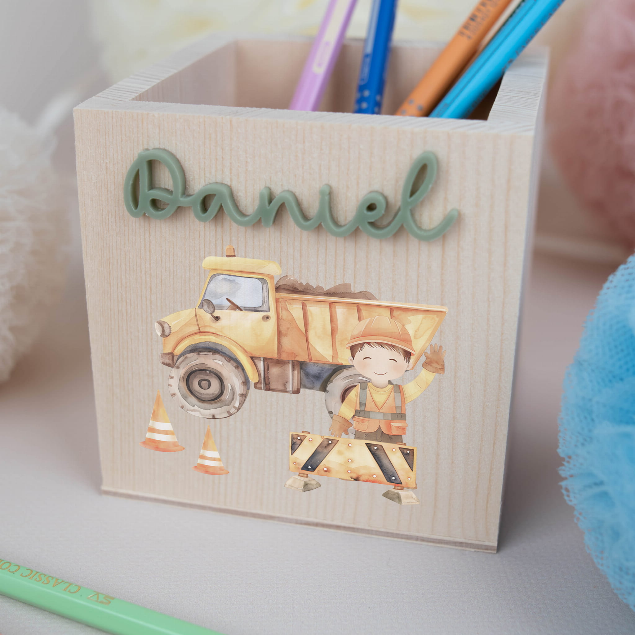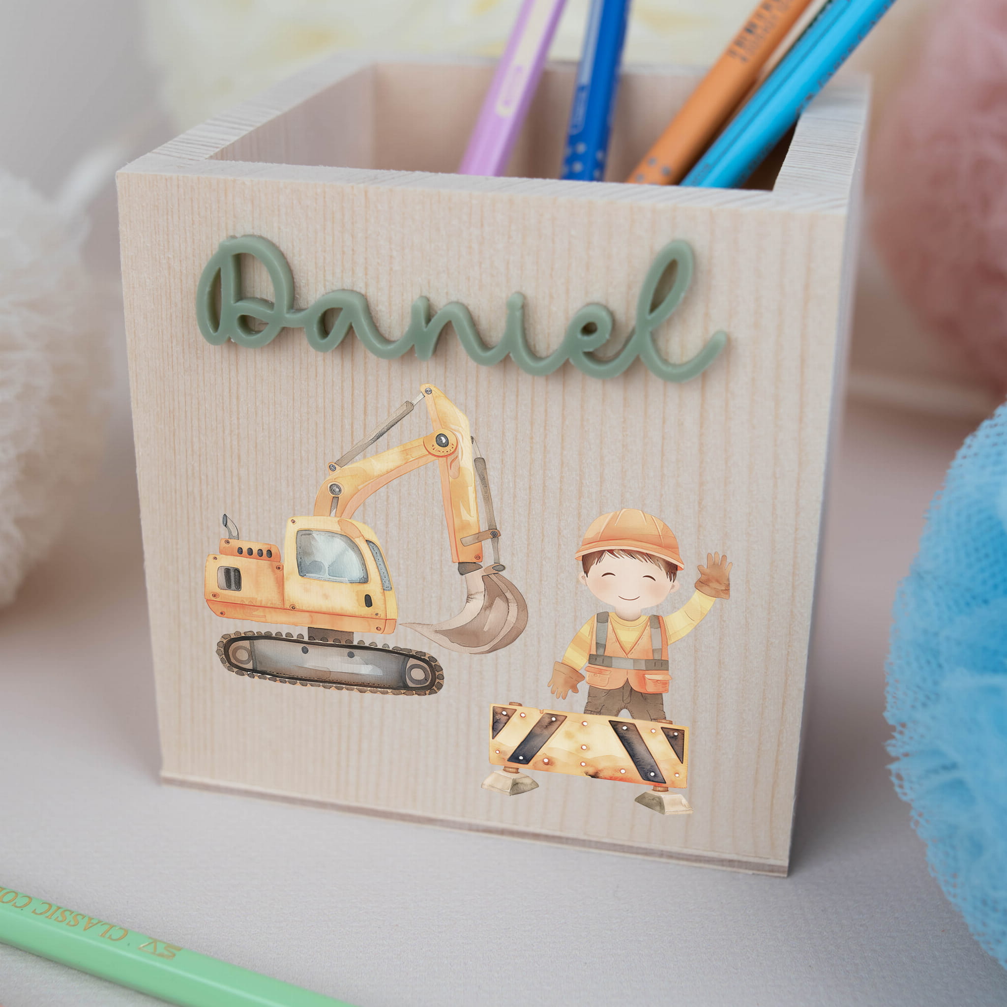 Warum unser Stiftehalter das perfekte Geschenk zur Einschulung ist: - Vollständig personalisierbar – Mit dem Namen Ihres Kindes in hochwertigem Acryl (15 Farben zur Auswahl) - Sicherer & umweltfreundlicher Druck – Mit GREENGUARD GOLD-zertifizierten Tinten, kindersicher, geruchsfrei und kratzfest - Motiv für Baustellen-Fans – Wählen Sie aus Baustellenmotiven wie Lkw, Krän, Bagger und Betonmischer - Perfekte Ergänzung zur Schultüte – Der personalisierte Stiftehalter lässt sich hervorragend mit einer Schultüte mit Baustellen-Motiven kombinieren - Nachhaltig & langlebig – Hergestellt aus hochwertigem Holz mit einzigartiger Maserung, das jedem Schreibtisch einen besonderen Charme verleiht