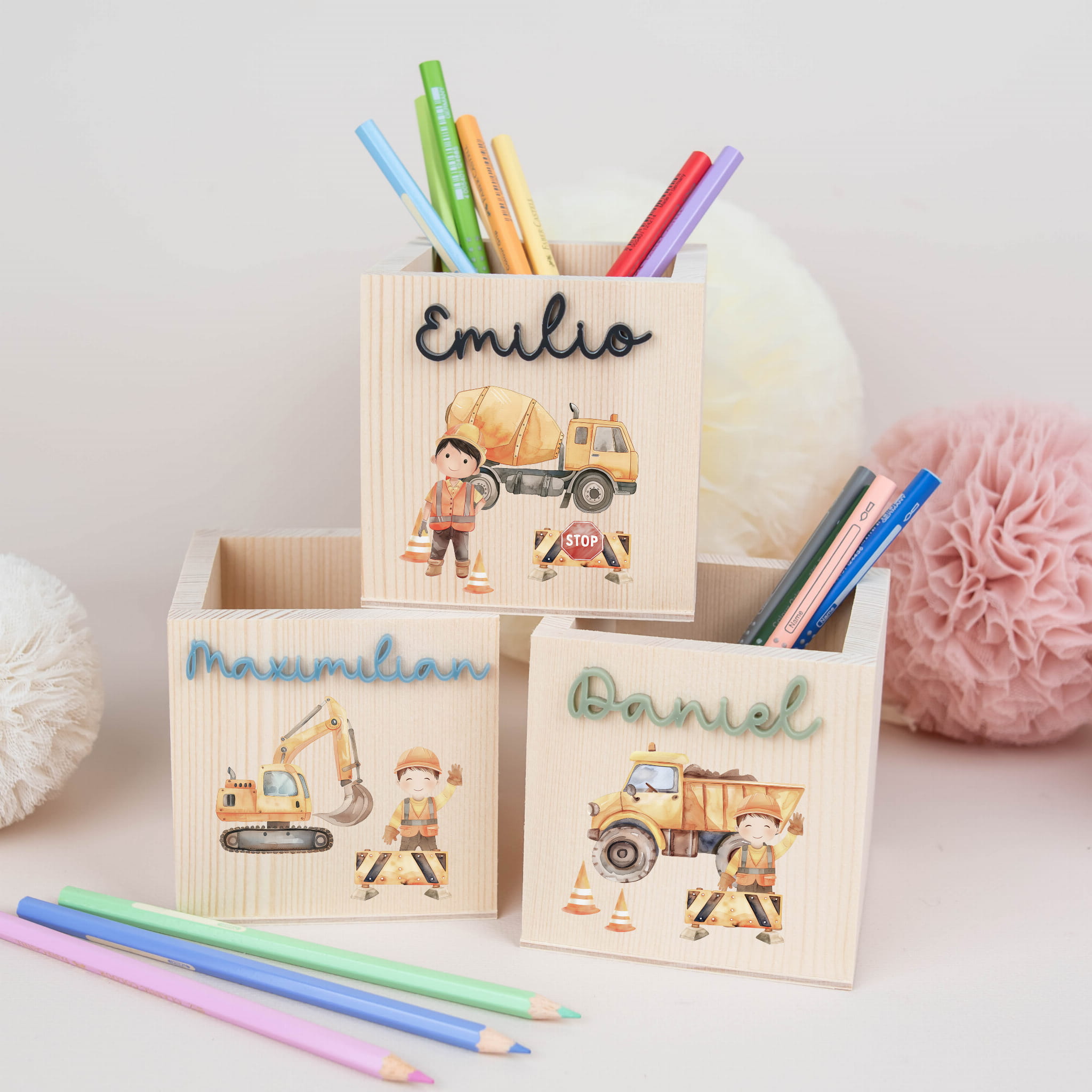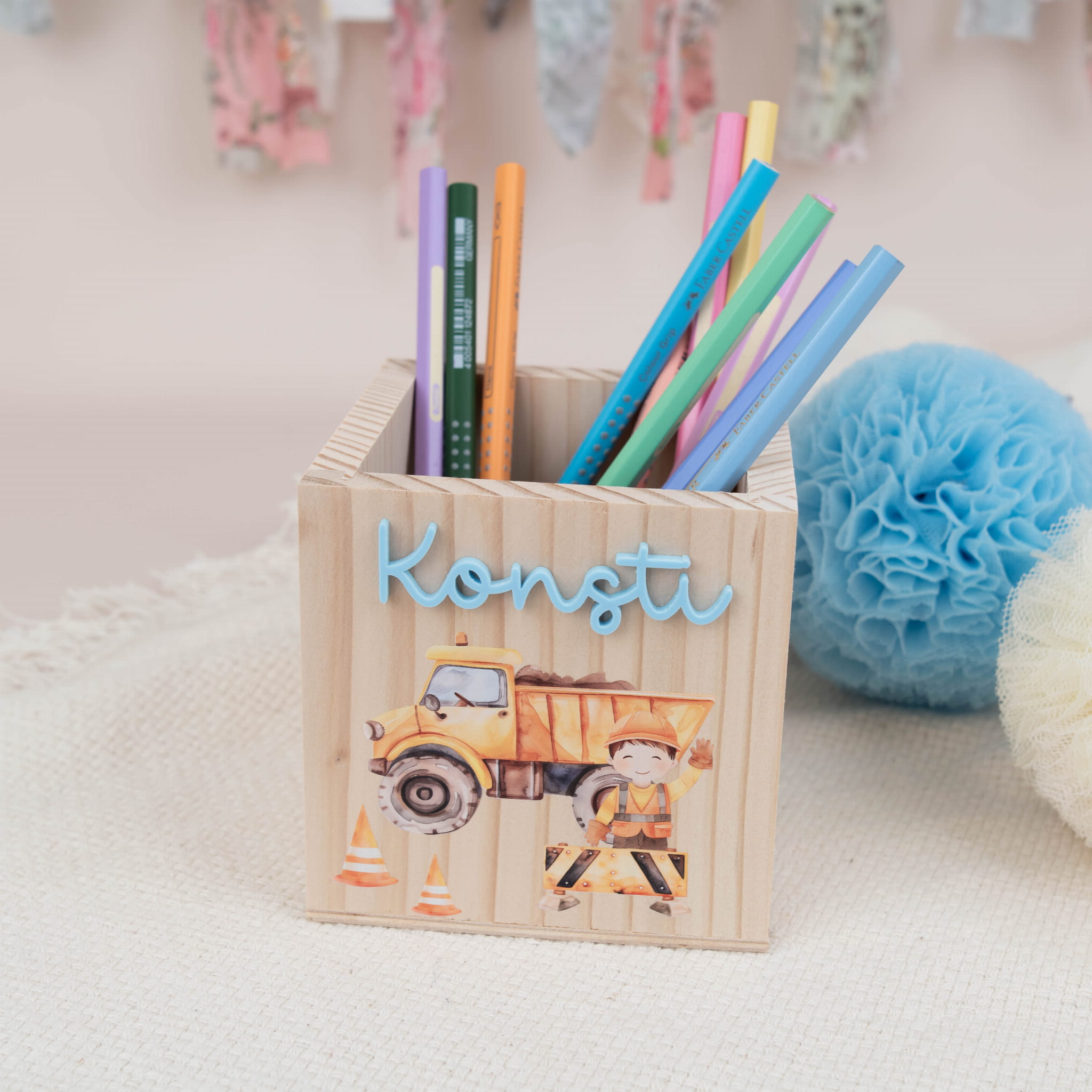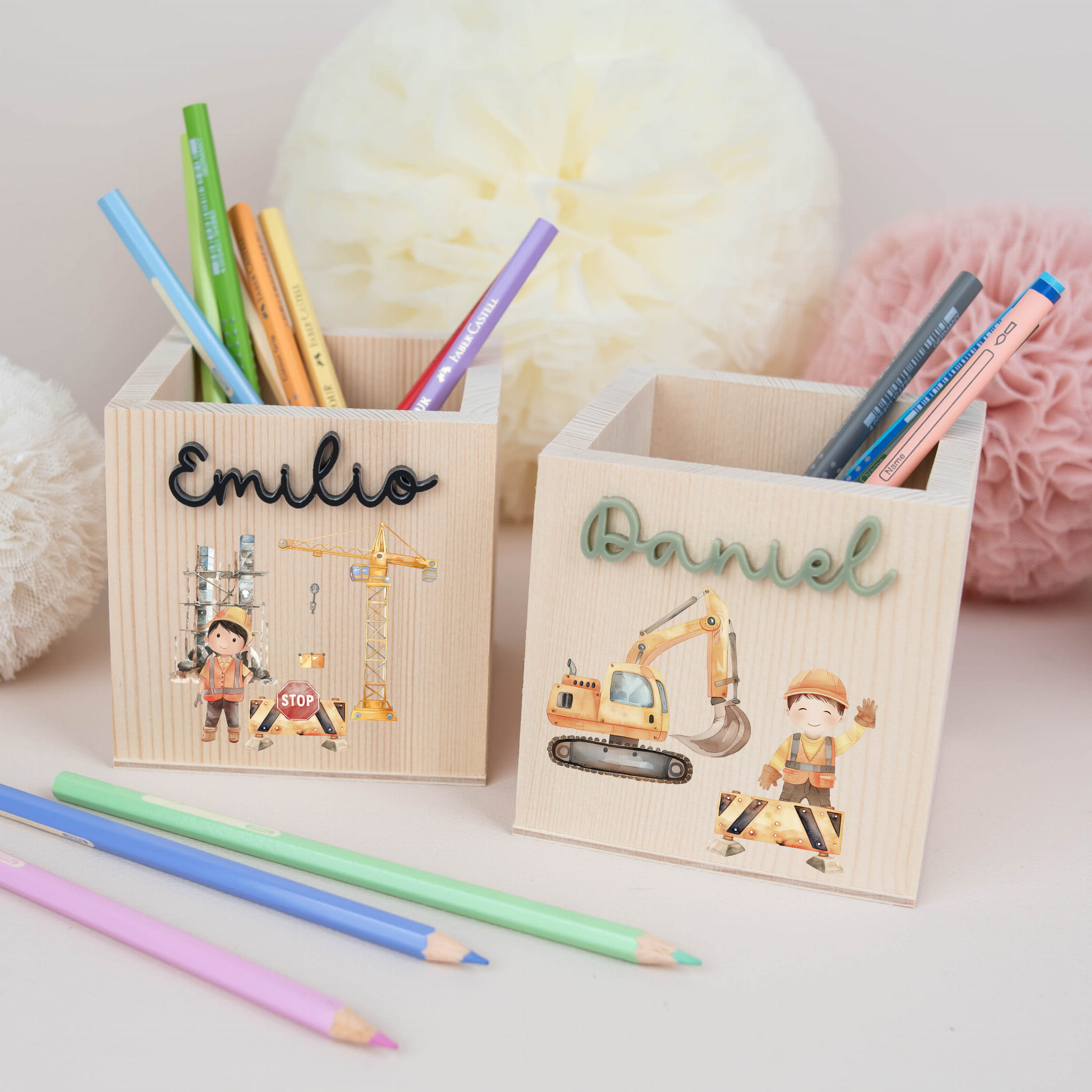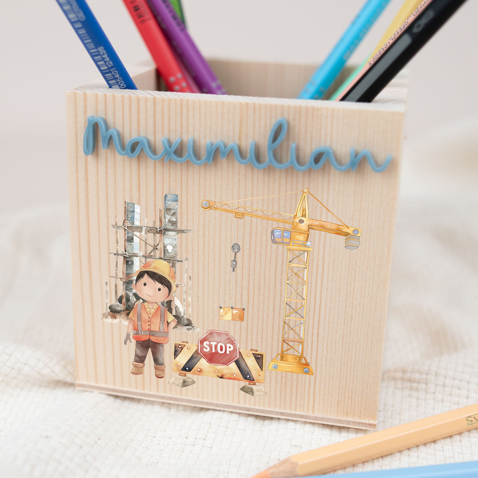 Unser personalisierter Holz-Stiftehalter ist das ideale Geschenk für Schulanfänger und junge Bauenthusiasten! Perfekt für Eltern, die ein praktisches und persönliches Geschenk für den Schulstart suchen. Der Stiftehalter hilft nicht nur dabei, Ordnung auf dem Schreibtisch zu schaffen, sondern verleiht jedem Arbeitsplatz eine persönliche Note – ideal für kleine Bauarbeiter und Fans von Baustellenmotiven!