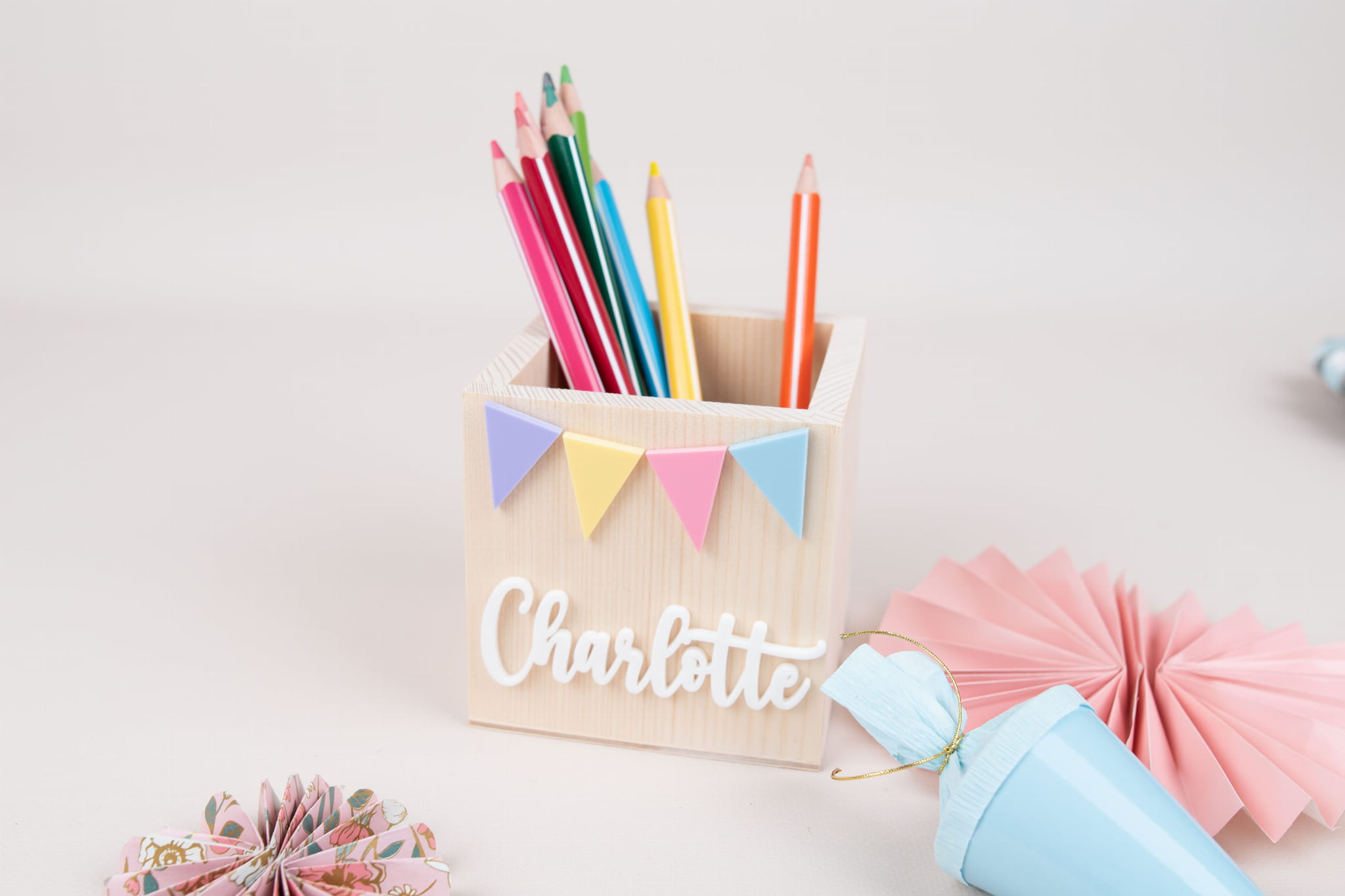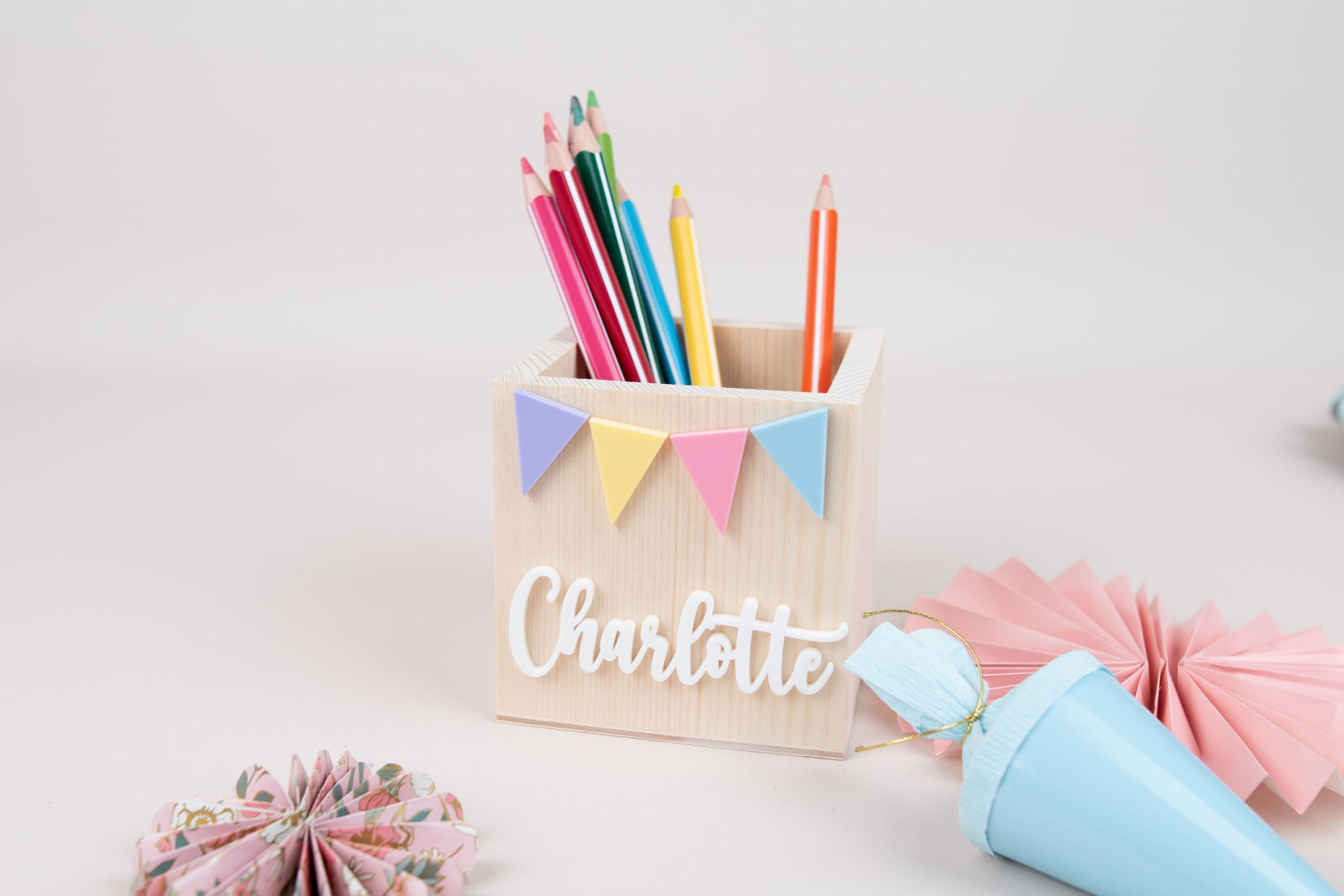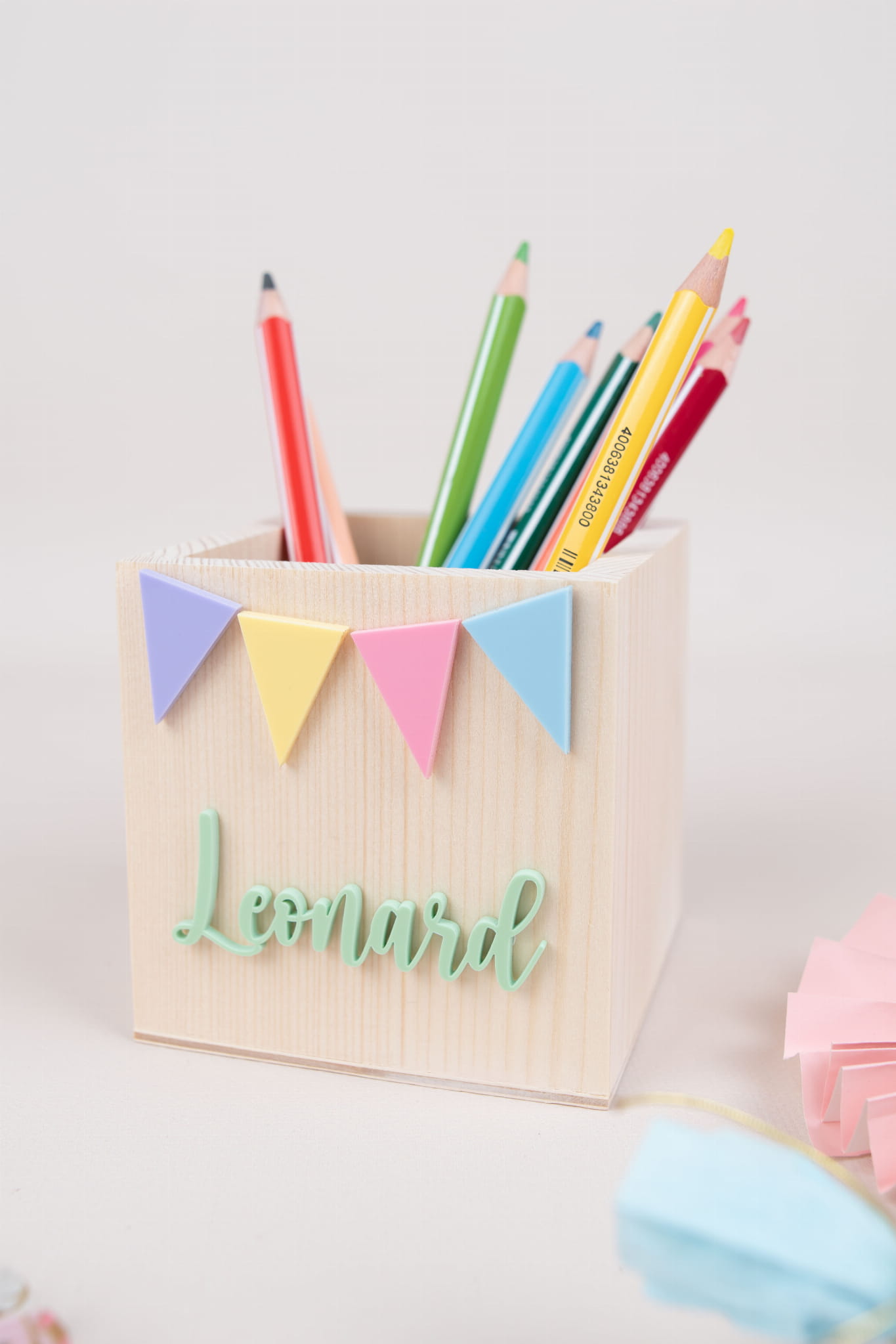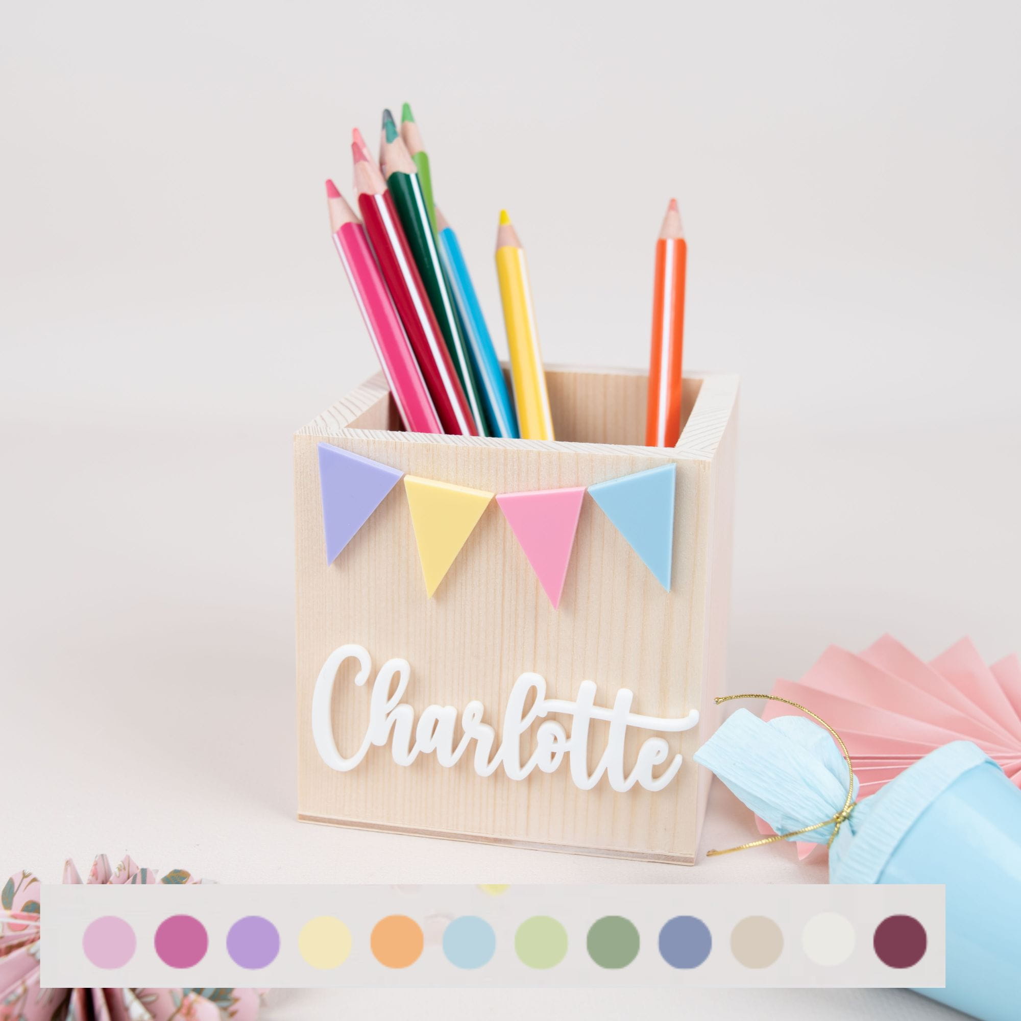Personalisierte Stiftehalter mit Wimpelkette -Motiv .