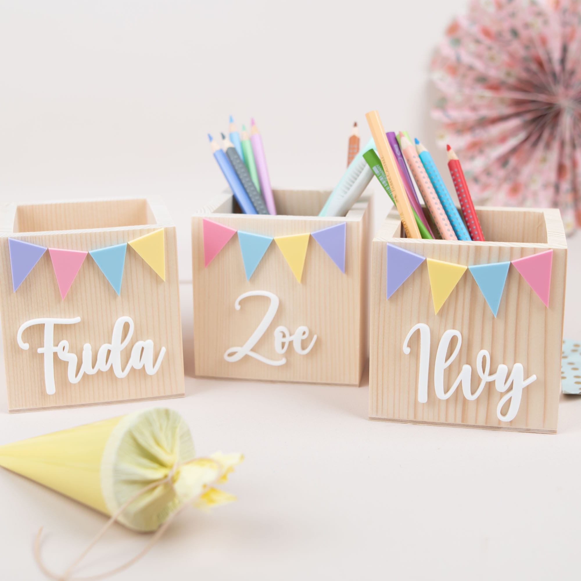Personalisierte Stiftehalter mit Wimpelkette -Motiv .
