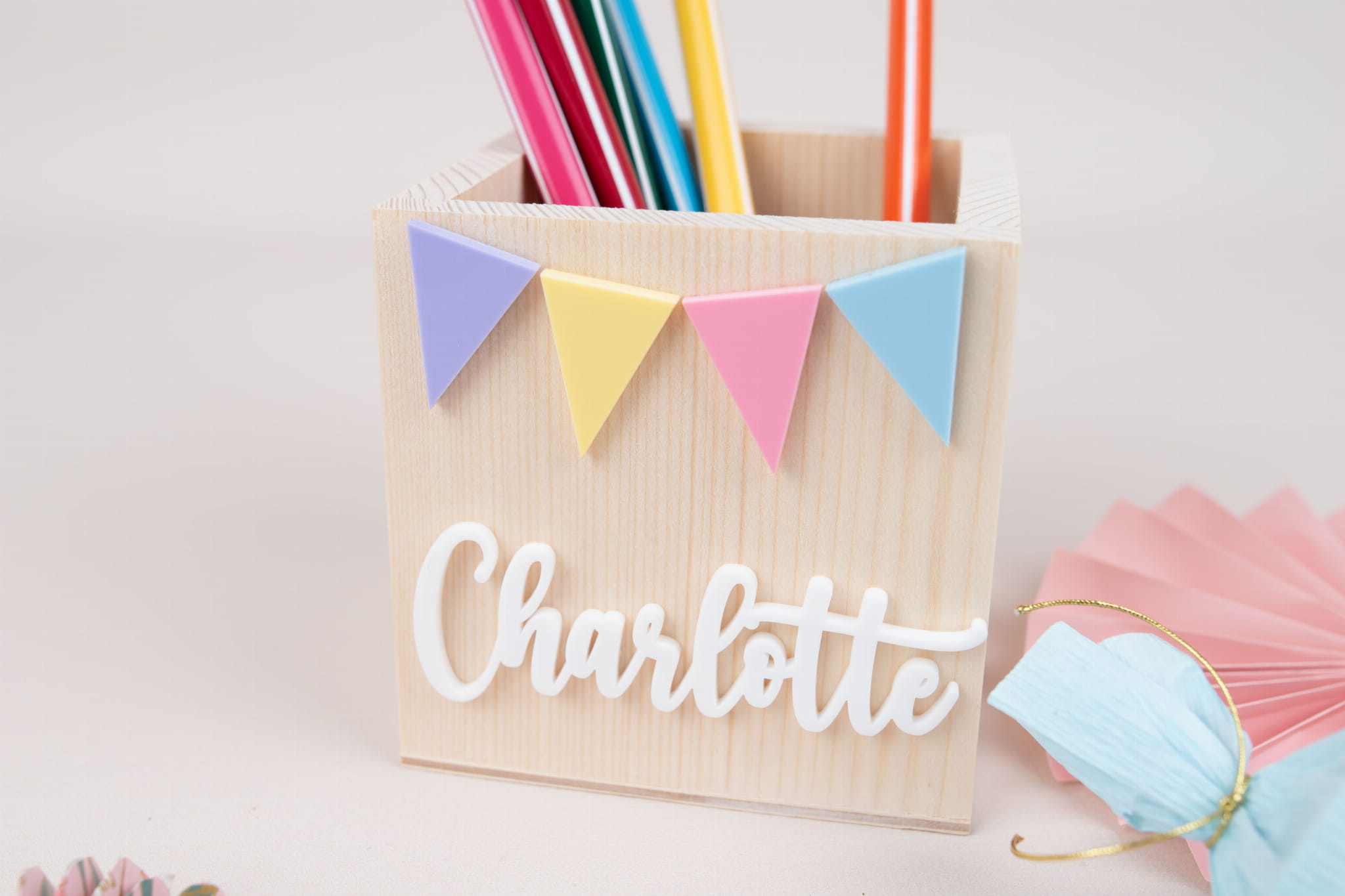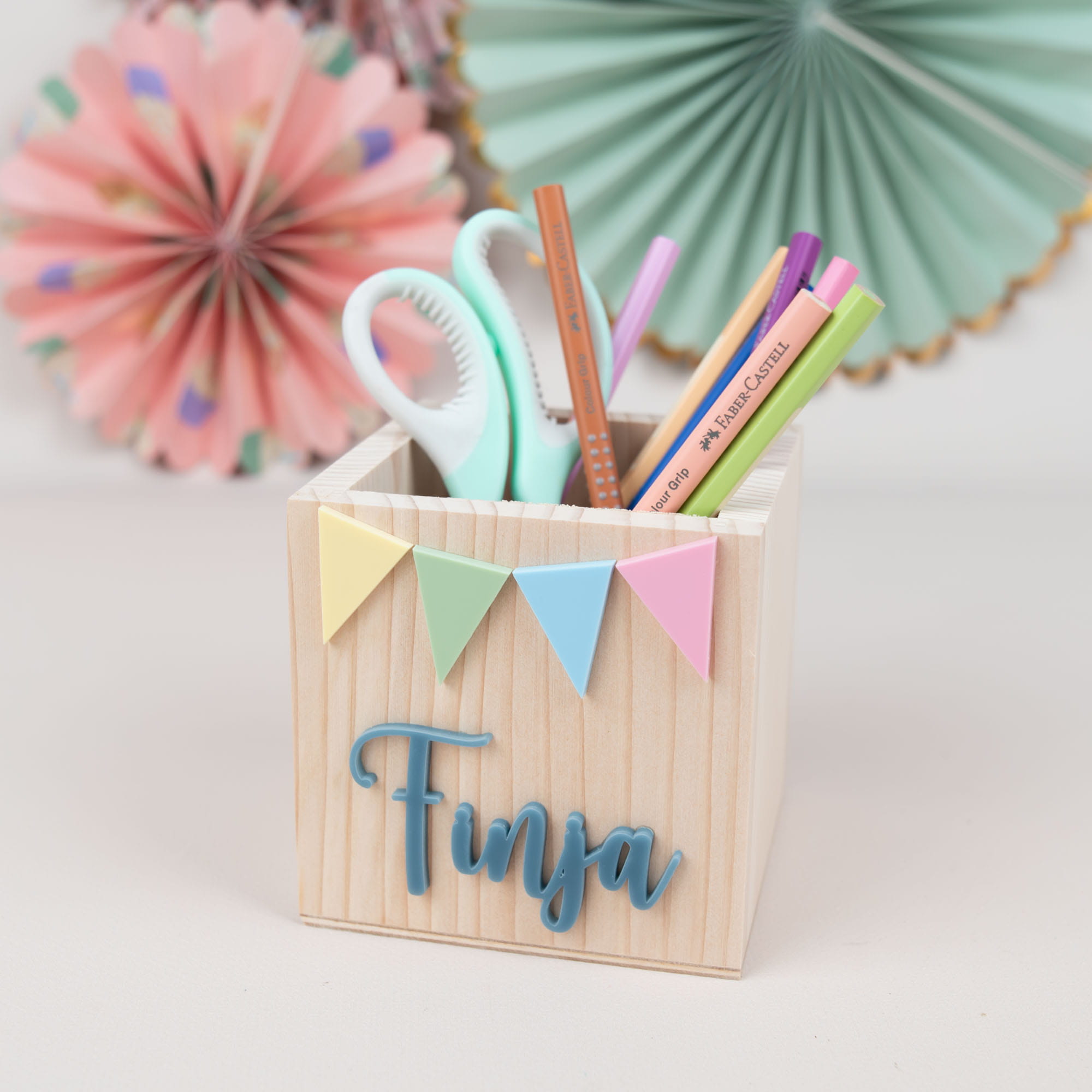 DETAILS Stiftehalter aus Holz Größe: 10 x 10 x 10 cm Personalisiert auf Vorderseite aus bunten Acryl . Sie können aus 12 Farben einen Namen in der Lieblingsfarbe Ihres Kindes auswählen Sollte Ihr Kind einen Doppelnamen haben, kontaktieren Sie uns bitte . In unserem Shop finden Sie einen passenden Schultute-Anhänger