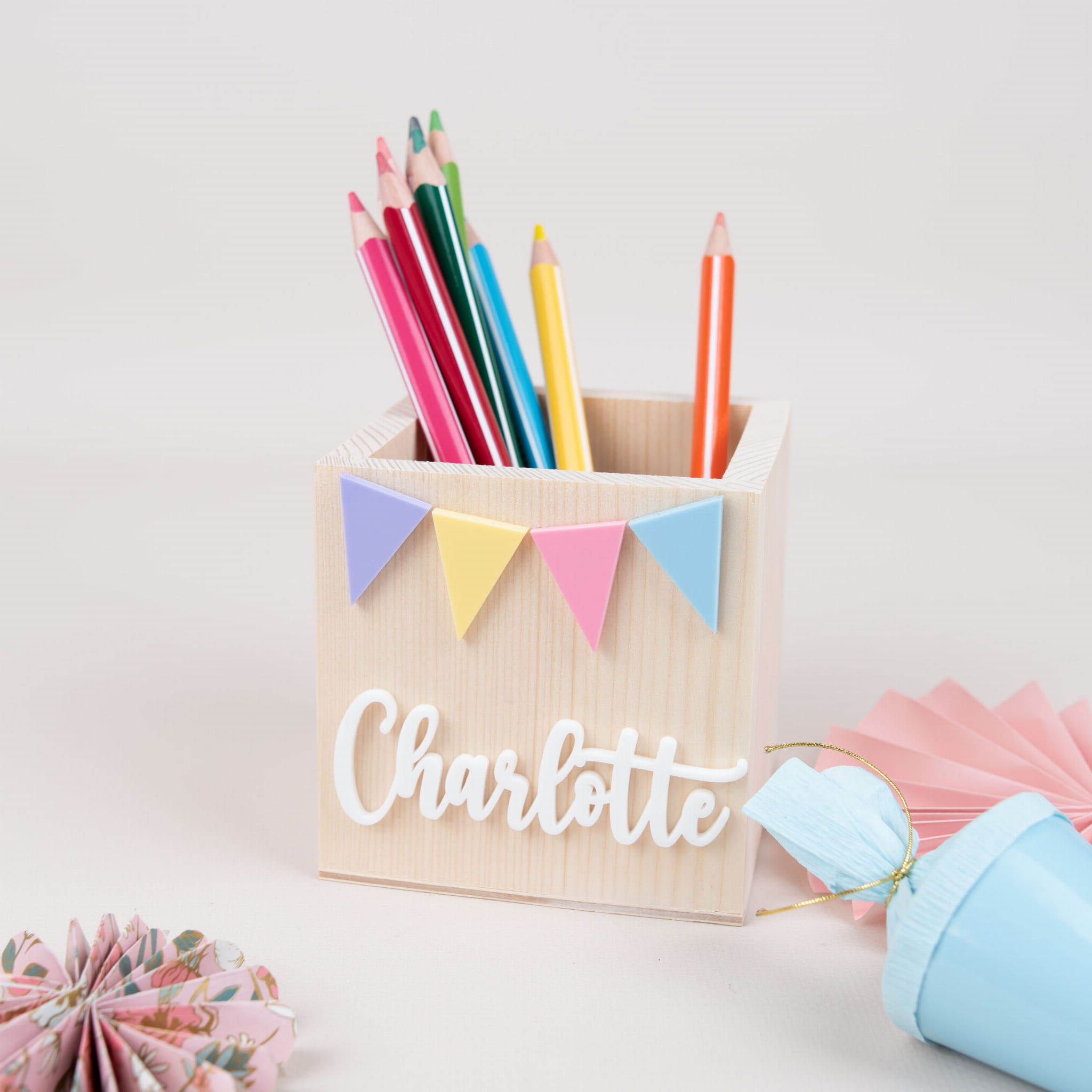Personalisierte Stiftehalter mit Wimpelkette -Motiv .